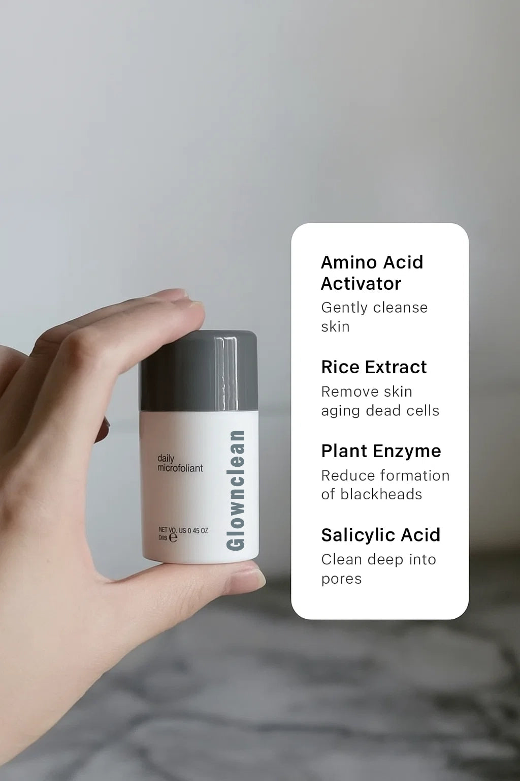 The Glownclean Daily Microfoliant is seriously amazing! It's a powder that turns into a creamy paste when mixed with water, and it gently exfoliates without irritating my skin. It makes my face feel smooth, bright, and fresh every time I use it. I love that it's gentle enough for daily use and doesn’t dry me out. Plus, the subtle smell is nice, and the packaging is super convenient. Definitely recommend if you want smooth, glowing skin!