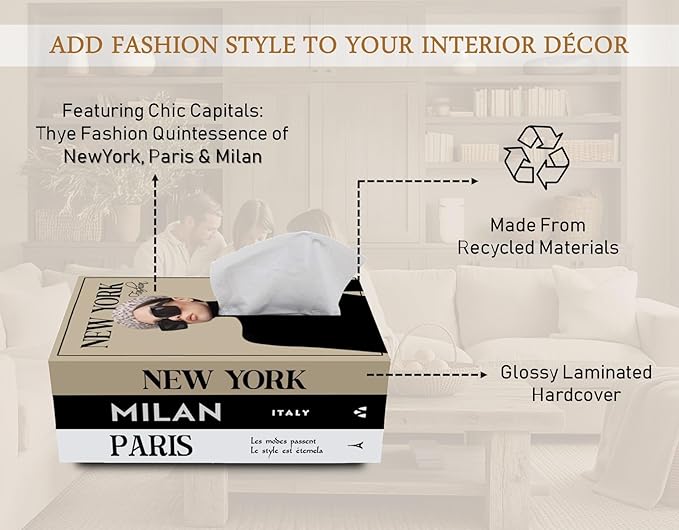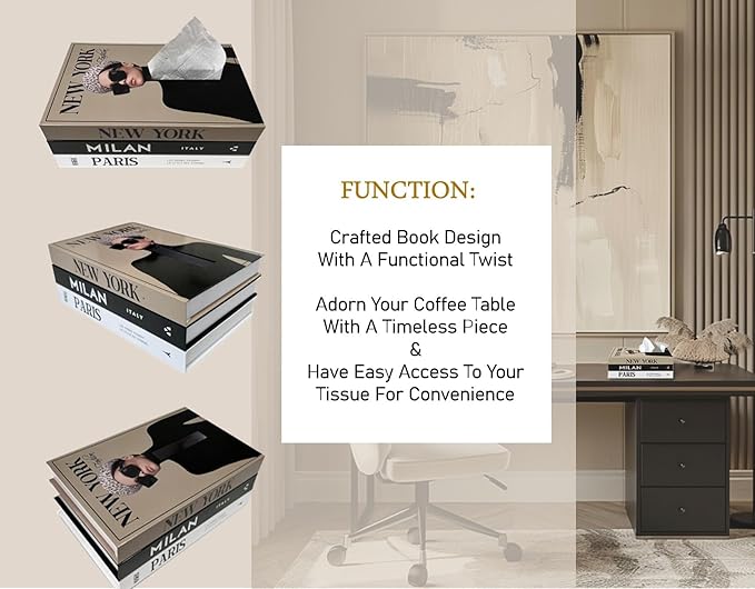 Unique Design, Decorative and Functional - The first of its kind, beautiful décor book style tissue box cover. Looking for a way to beautify your space and still have easy access to your tissue, Look no further. The most functional piece of decoration you need. A perfect blend of aesthetic appeal and practicality. Let’s hide the patterned generic tissue box pattern and make your space more unique, fashionable and chic